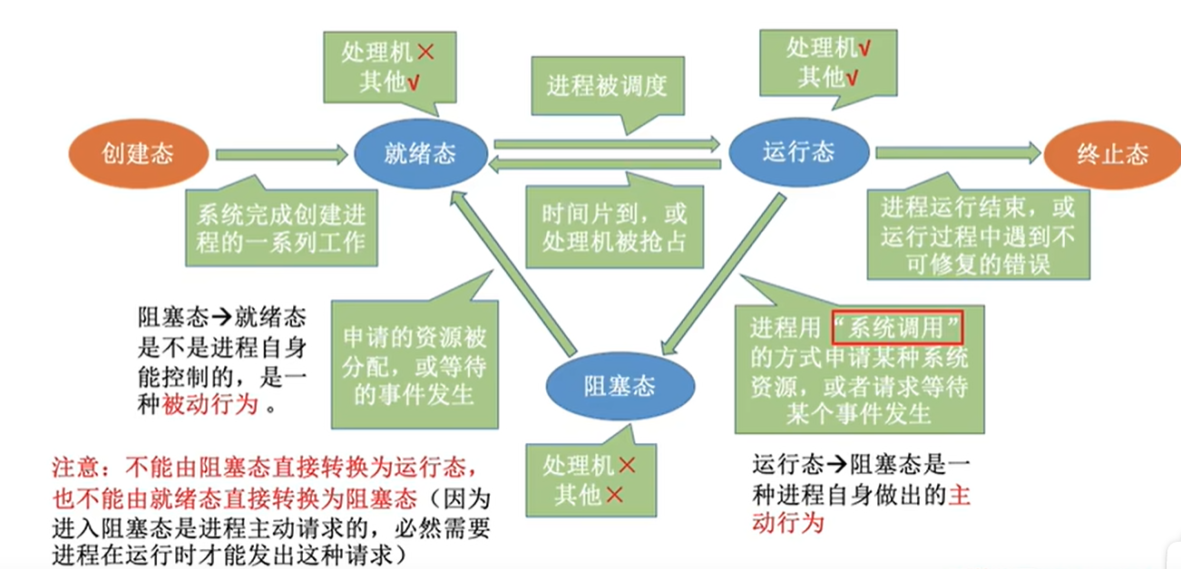 - 就绪态:进程创建完成的状态,但是没有空闲$CPU$,因此暂时不能运行